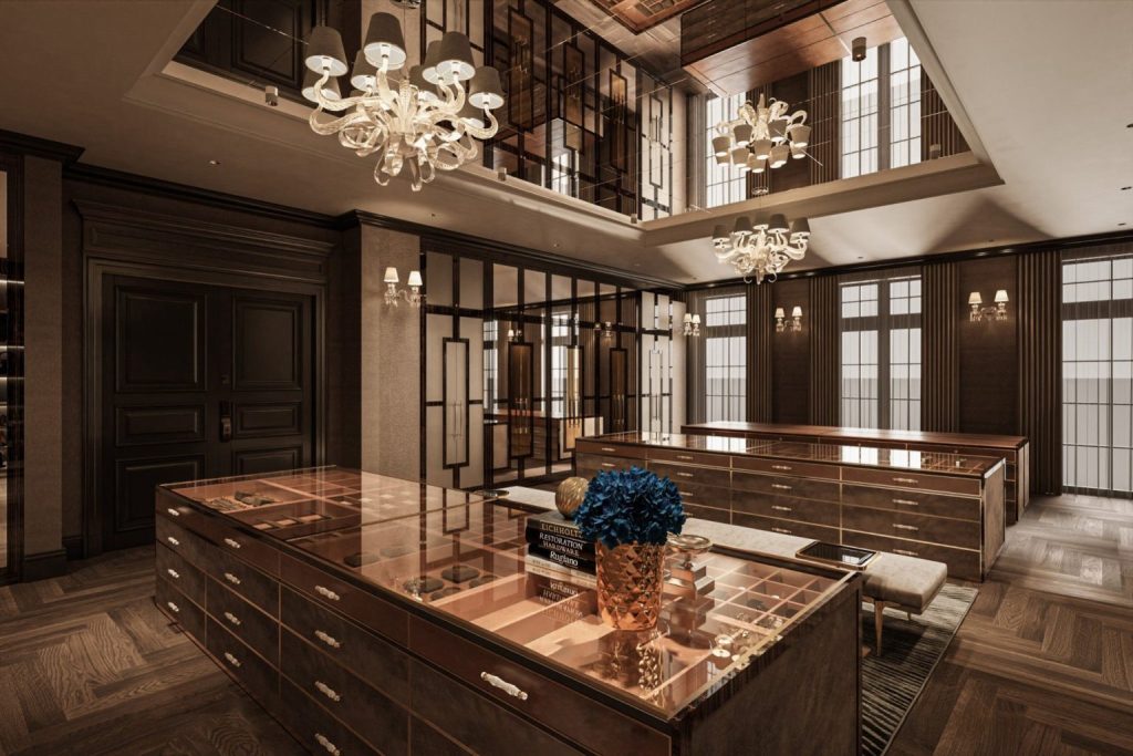Lighting plays a pivotal role in every space, especially for those embracing a luxurious lifestyle. In accordance, a crystal chandelier can illuminate the dressing room, transforming its ambiance into a modern and captivating space. Integrated LED lights on shelves further highlight valuable items and simplify searching. Additionally, the automatic sensor LED lights inside cabinets will also help illuminate upon opening, which enhances user’s convenience.